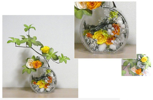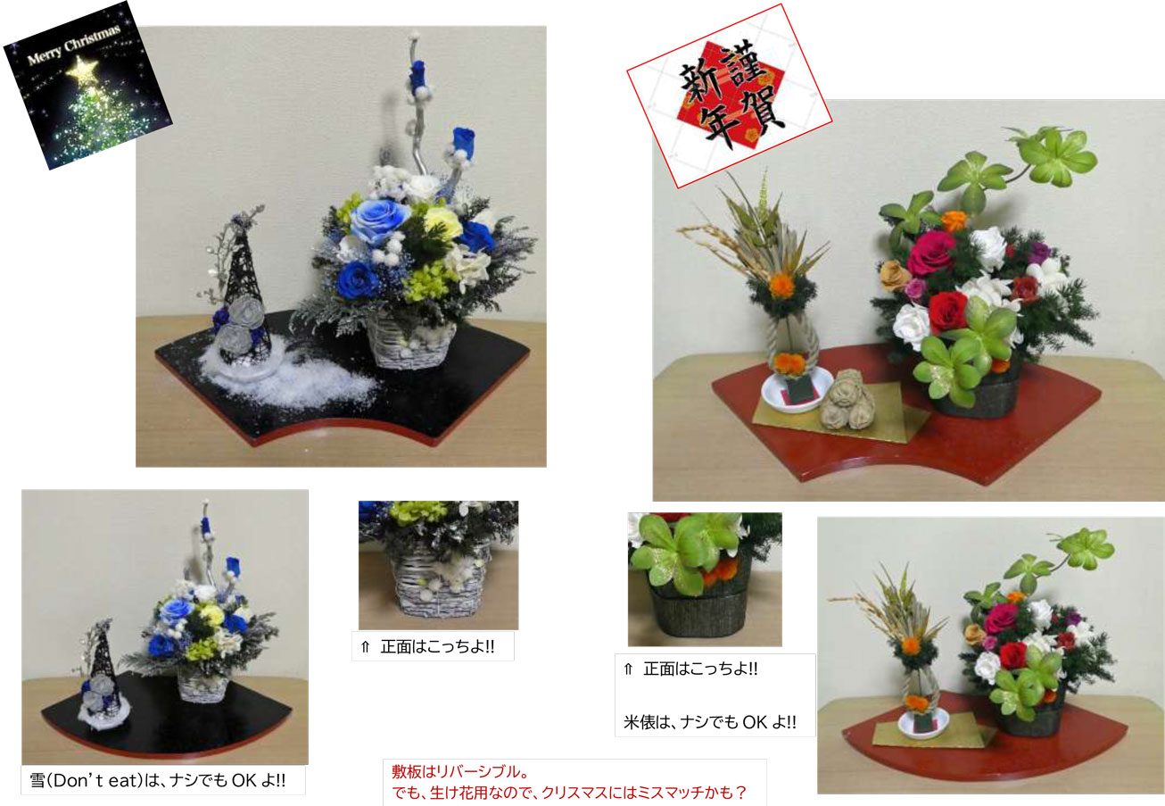 | いろんな置き方・飾り方をして、楽しんでいただけるよう、ちょっと工夫した2例です。 左は小さな折り畳み式のミラーを使用し、ミラーの蓋面を中心に花をアレンジしています。 右はプラスティックの造花(アンスリュームの花)を解体して器にした細やかなアレンジで、 赤い紙ボックスに、セロファンで保護した作品を収納した上で、さらにしっかり梱包して宅配便で送付。 赤い紙ボックスの蓋を利用して飾ることで、花の細やかさがいっそう引き立ちます。 ![]() |